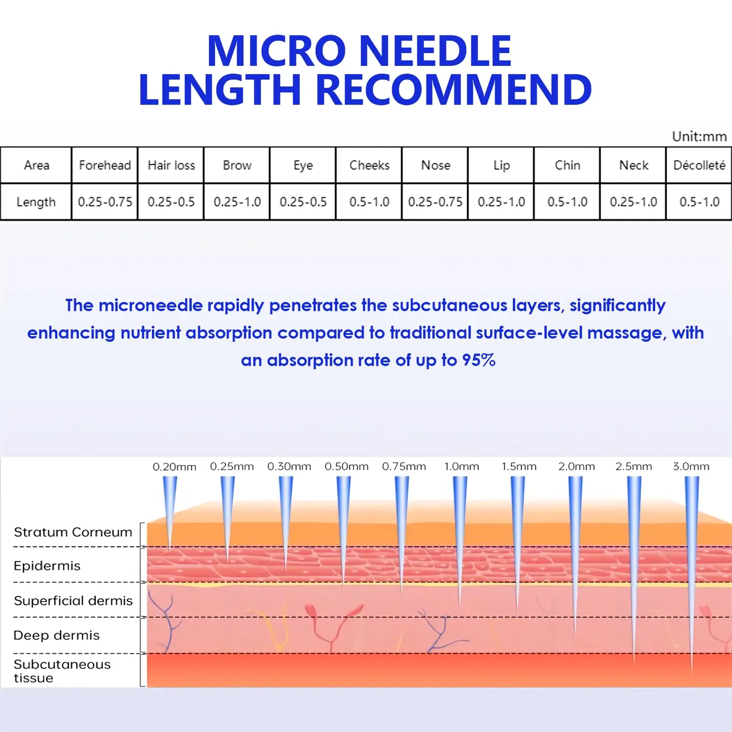 - Cartouches Nano : Elles restent dans l'épiderme, ce qui les rend parfaites pour les traitements BB Glow, l'amélioration du teint, la lutte contre les ridules, l'amélioration de la pénétration des produits et la stimulation de la repousse des cheveux. Les cartouches Nano conviennent à un usage plus fréquent et ne nécessitent généralement pas de crème anesthésiante.